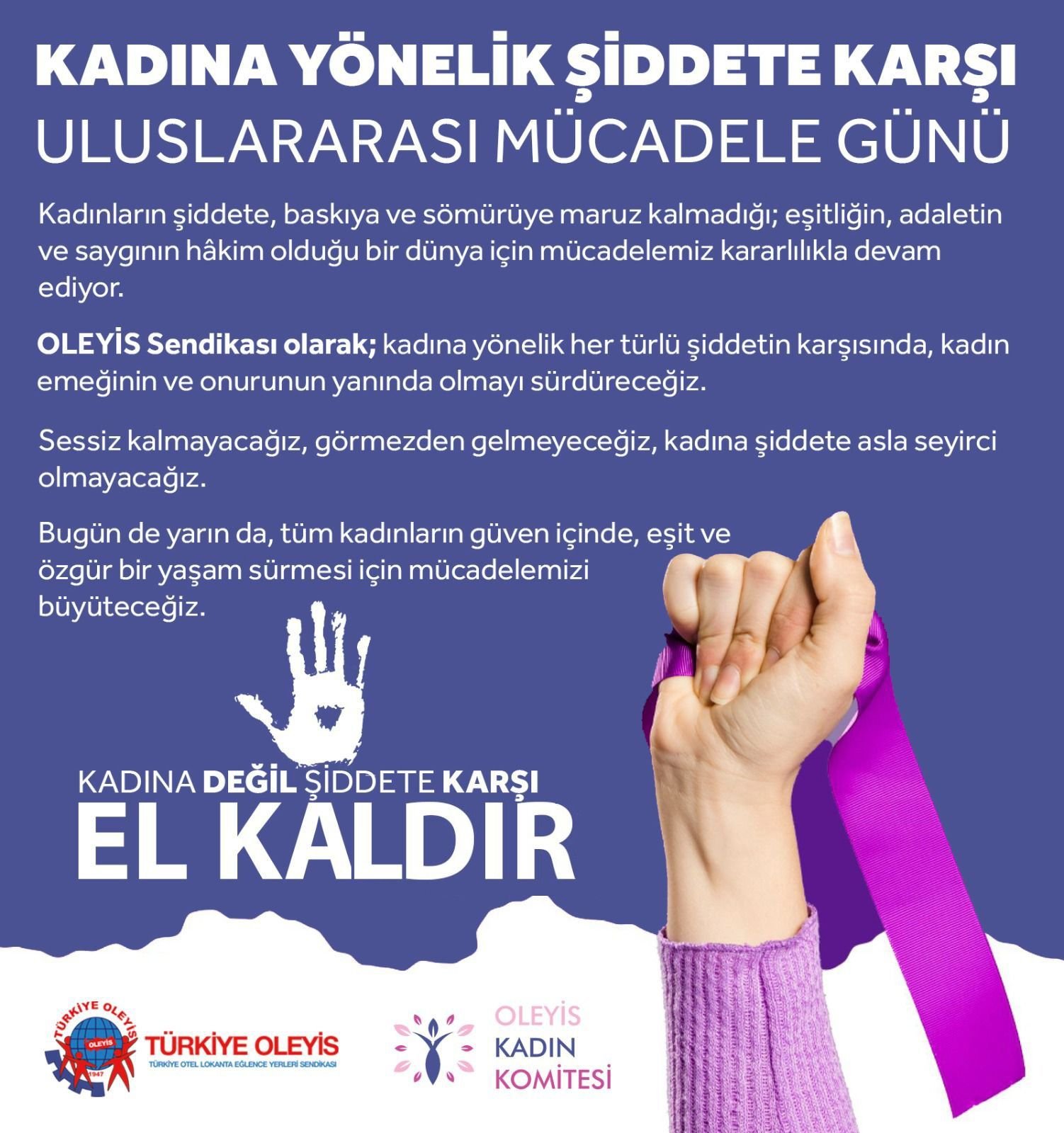 OLEYİS Sendikası olarak; kadına yönelik her türlü şiddetin karşısında, kadın emeğinin ve onurunun yanında olmayı sürdüreceğiz.
