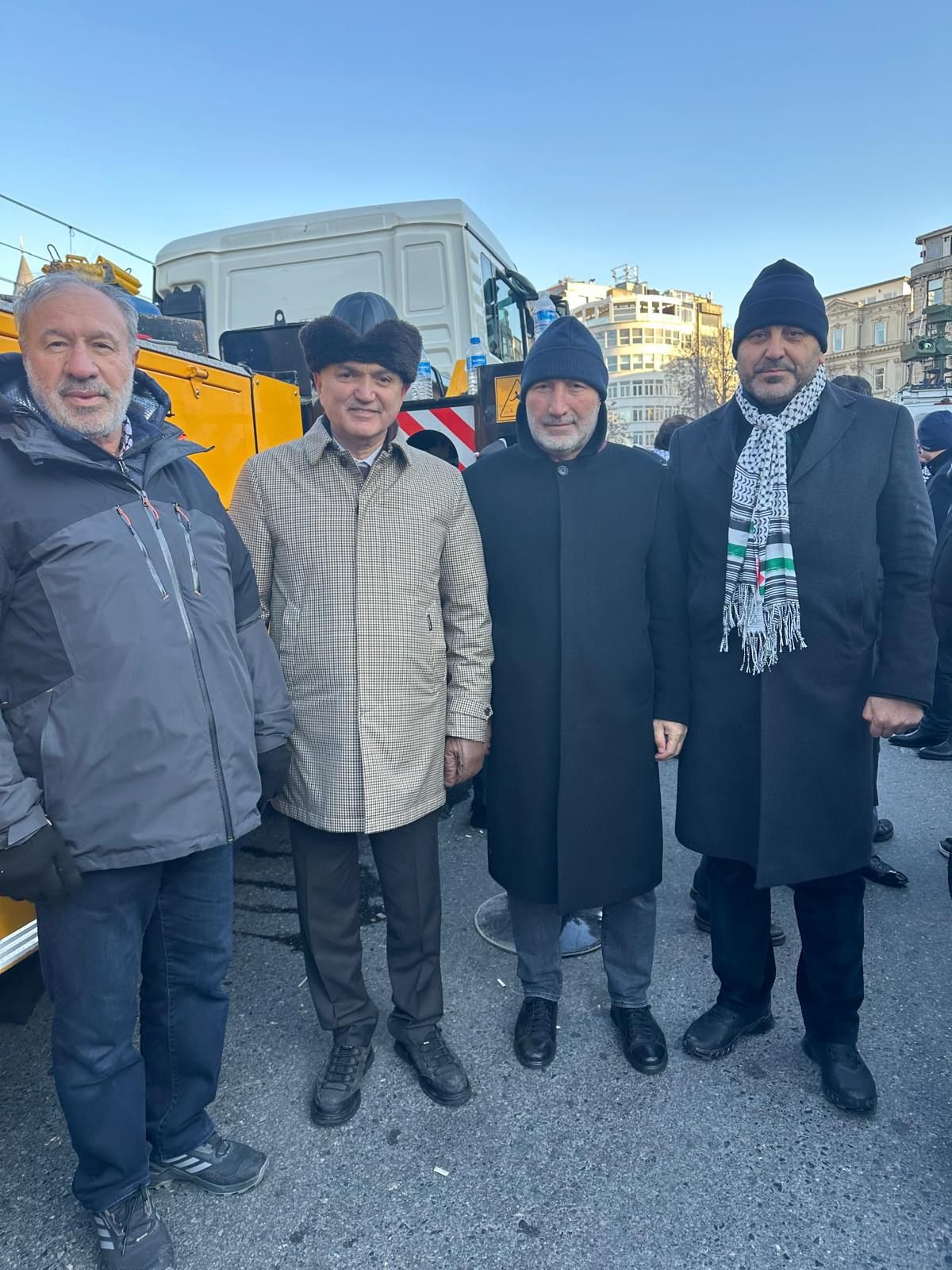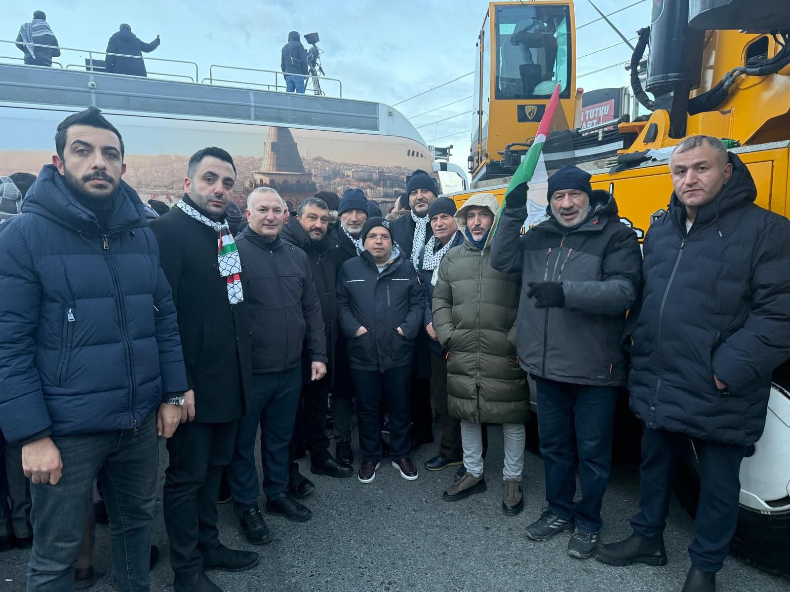 Genel Başkanımız Mehmet Keskin, 1 Ocak’ta Galata Köprüsü’nde düzenlenen Filistin’e destek eylemine; Konfederasyonumuz HAK-İŞ’e bağlı kardeş sendikalarımızdan Öz Güven-Sen Genel Başkanı Ömer Yılmaz, Medya İşçileri Sendikası Genel Başkanı Sezai Ballı, Öz Ağaç-İş Sendikası Genel Başkanı Tuncay Dolu, Öz İletişim-İş Sendikası Genel Başkanı Semih Aydıner, Liman-İş Sendikası Genel Başkanı Önder Avcı ve Öz Maden-İş Sendikası Genel Başkanı Fahrettin Kütükçü ile birlikte katılım sağladı.